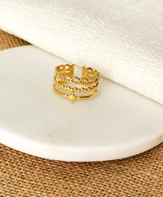 Dainty Gold Tone Open Ring - Triple Layer, Star Embellished, Adjustable